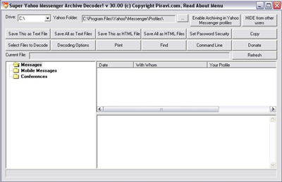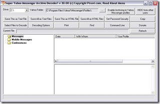 YahDecode is a Yahoo message archive decoder. It can decode archived messages and archived conferences of any yahoo user without you having their password. It has another cool feature which lets you enable archiving for any yahoo user without having to know their password.